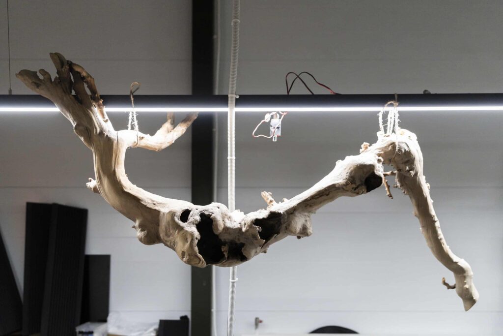 Механизмы активировались в зависимости от ответов зрителей на опрос о взаимоотношениях человека и нейросети. Каждый ответ оставлял след на камне, постепенно меняя его форму. В результате сформировалась уникальная композиция, которая отражала взаимодействие человеческого восприятия, машинной обработки и природных процессов.