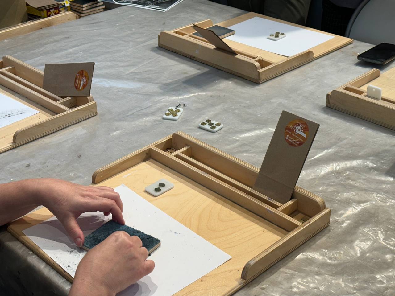 Каждый участник смог самостоятельно отполировать металлические элементы и закрепить их на фрагментах из белого стекла. Как отметил Николай Плоткин, такое же стекло украшает стены в залах Опочивальня и Табакерка Зубовского флигеля. Гости унесли с собой авторский брелоки, созданные по мотивам дворцового декора.