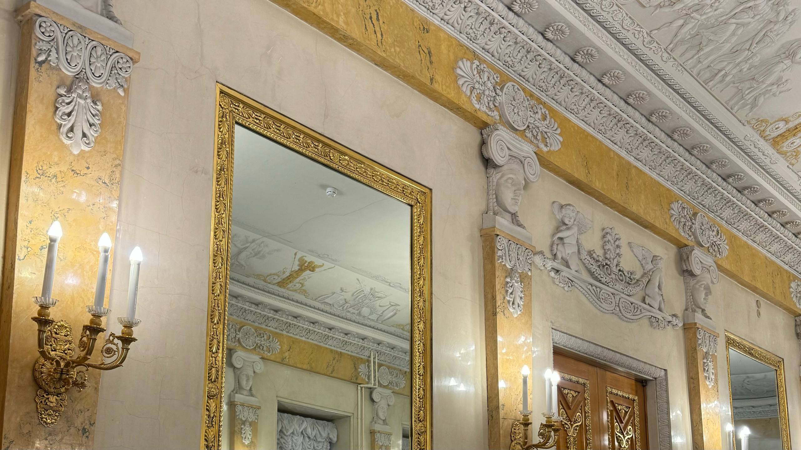 Когда группа заглянула в бальный зал, там как раз проходила театрализованная экскурсия-бал. Танцующие были в костюмах XIX века, а у зрителей была редкая возможность увидеть, как оживает дворцовая атмосфера — со светом люстр, музыкой и движением. Подобные программы Елагин дворец проводит регулярно, соединяя историю и живое искусство.